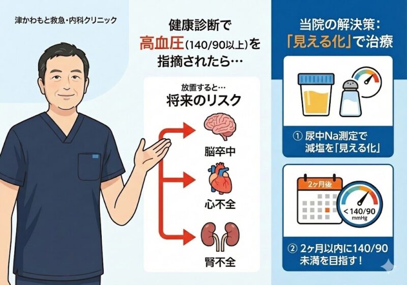 【高血圧を指摘されたら】健康診断で高血圧を指摘されたら?放置するリスクと治療の目安|津かわもと救急・内科クリニック