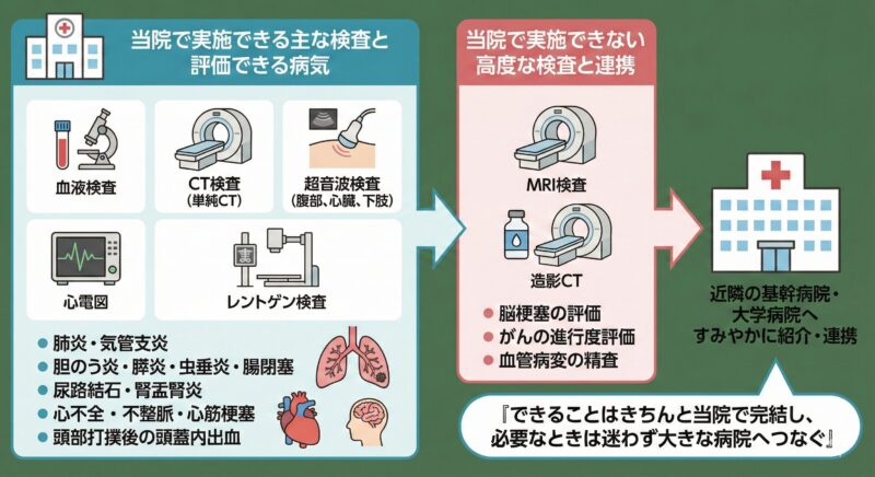 その「軽い症状」の段階で、必要な検査を行い、重い病気かどうかを見極めることが救急・内科クリニックの大きな役割です。血液検査、CT検査、超音波(エコー)、心電図などの検査は、心筋梗塞や肺炎、胆石、尿路結石、脳卒中など、多くの救急疾患の診断に必須とされています。(Yancey & O’Rourke, Emergency Department Triage, 2023)