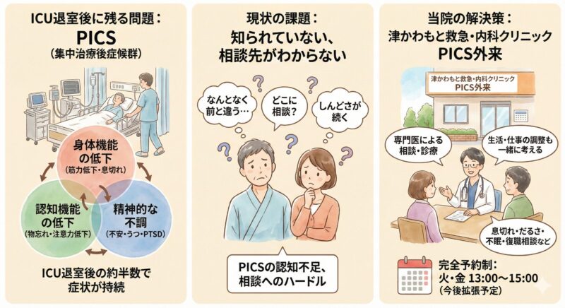 もしご本人やご家族がICUを退室されたあとに「なんとなく前と違う」「説明しづらいけれどつらい」症状が続いている場合は、検査や治療だけでなく、生活や仕事の調整も含めて一緒に考えていきたいと思います。