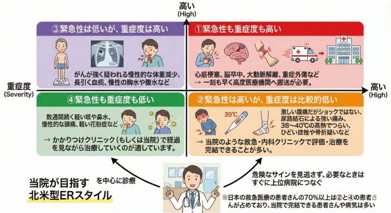 当院が目指すのは、「②:緊急性は高いが重症度は比較的低い」と「④:緊急性も重症度も低い」患者さんを中心に診療しつつ、「①や③にあたる危険なサインを見逃さず、必要なときはすぐに上位病院につなぐ北米型ERスタイル」です。幸いなことに日本の救急医療の患者さんの70%以上は②と④の患者さんが占めており、当院で完結できる患者さんや病気は多いと考えています。