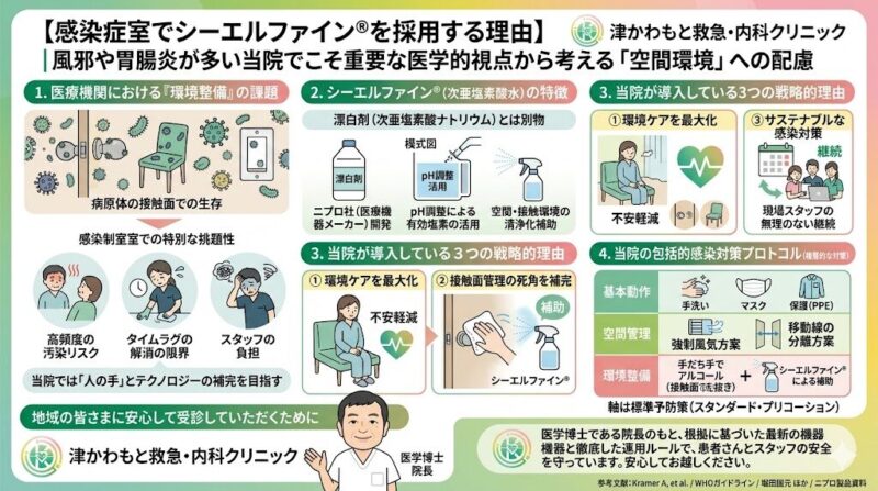 【感染症室でシーエルファイン®を採用する理由】|風邪や胃腸炎が多い当院でこそ重要な医学的視点から考える「空間環境」への配慮│津かわもと救急・内科クリニック