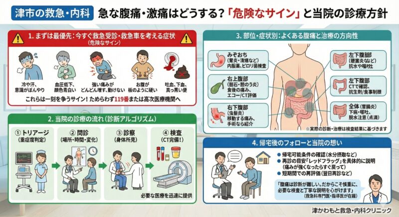 【津市の腹痛外来】急な腹痛・激痛の診断と対応|救急医が解説する「危険なサイン」とは?|津かわもと救急・内科クリニック
