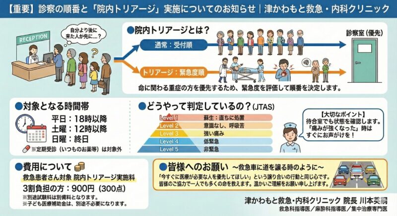【重要】 診察の順番と「院内トリアージ」実施についてのお知らせ|津かわもと救急・内科クリニック